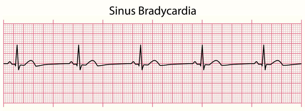 A patient’s rhythm can go from the above normal sinus rhythm to the one below, which is Sinus Bradycardia (or a slow heart rate)